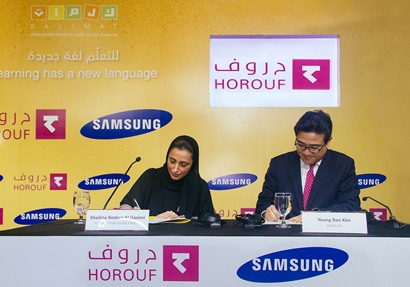 وقع الاتفاقية المؤسس والرئيس التنفيذي لمجموعة كلمات للنشر الشيخة بدور بنت سلطان القاسمي، ورئيس شركة سامسونج الخليج للإلكترونيات يونغ سو كيم، وتُعتبر الاتفاقية هي التعاون الأول لسامسونج مع مزود برامج تعليمية باللغة العربية، وخطوة نوعية نحو استخدام التقنيات التكنولوجية في دعم التعليم الذكي باللغة العربية على مستوى دولة الإمارات العربية المتحدة والوطن العربي.