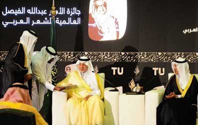 وقدّم سموه الشكر والتقدير للقائمين على أكاديمية الشعر العربي وجائزة الأمير عبدالله الفيصل العالمية للشعر العربي سائلاً الله لهم التوفيق لتحقق هذه الجائزة الآمال والطموحات. وتبلغ قيمة جائزة الأمير عبدالله الفيصل العالمية للشعر العربي مليون ريال موزعة على ثلاثة أفرع ، الأول للشعر العربي وتبلغ جائزته نصف مليون ريال وتمنح الجائزة لشاعر عربي معاصر على مجمل أعماله الشعرية التي اتسمت بغنى التجربة ، بحيث لا يقل إنتاجه الشعري عن 3 دواوين مطبوعة ومكتوبة باللغة العربية الفصحى، وأن تلتزم الدواوين المقدمة في موسيقاها بالإيقاع الشعري المنضبط ( العمودي والتفعلية ) وأن يتم ترشيح الشاعر من خلال إحدى المؤسسات الثقافية المتخصصة أو دور النشر العربية أو العالمية ، فيما لا يحق لأي عضو في لجان التحكيم التقدم للجائزة في السنة التي يشارك فيها في أعمال التحكيم.
