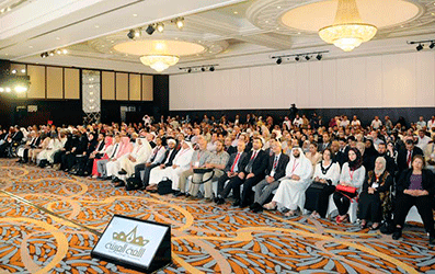 لقد تم بحمد الله وتوفيقه عقد المؤتمر الدولي الرابع للغة العربية برعاية غالية من صاحب السمو الشيخ محمد بن راشد آل مكتوم نائب رئيس دولة الإمارات العربية المتحدة، رئيس مجلس الوزراء، حاكم دبي أيده الله، خلال الفترة 17 – 21 رجب الموافق 1436هـ 6-10 مايو 2015 في دبي. وبهذه المناسبة الدولية الكبيرة يسر المجلس الدولي للغة العربية باسم جميع المنظمات العربية والدولية، والاتحادات والمجامع والجمعيات والهيئات المشاركة في تنظيم المؤتمر، وباسم ما يزيد عن 2300 من العلماء والباحثين والمسؤولين والحضور الذين أتوا من أكثر من 74 دولة أن يتقدم إلى دولة الإمارات العربية المتحدة حكومة وشعبا بالشكر والتقدير على استضافتها للمؤتمر وعلى الجهود التي يقدمها حكام دولة الإمارات العربية المتحدة لخدمة اللغة العربية، ويخص بالشكر صاحب السمو الشيخ محمد بن راشد آل مكتوم نائب رئيس الدولة رئيس مجلس الوزراء حاكم دبي راعي المؤتمر أيده الله، والذي اقترن اسمه باللغة العربية نتيجة المبادرات العديدة التي قدمها لخدمة اللغة العربية، ورعايته الغالية لأكبر مؤتمر علمي فكري ثقافي يعقد لخدمة اللغة العربية، ومنحه جائزة محمد بن راشد للغة العربية التي تعد أكبر جائزة تقدم في تاريخها. ويؤكد المجلس بأن هذه الجائزة الغالية التي تمنح سنويا في مجالاتها المختلفة سوف تقود الأعمال الناجحة والمبادرات الخلاقة والتجارب الإبداعية في مختلف المجالات التي تتعلق باللغة العربية، وتعد هذه الجائزة حافزا لجميع المشغولين والمحبين والمهمومين باللغة العربية وقضاياها وموضوعاتها المختلفة، وستكون اللغة العربية وفية لسموه مقابل بره واهتمامه بها ومبادراته التي تعزز مكانها ومكانتها وذلك بتوثق جهوده المختلفة من قبل الباحثين والعلماء الذين استجابوا لدعوة صاحبة الجلالة اللغة العربية من دول العالم المختلفة، بالرغم من عناء السفر، وضعف الإمكانات، والمشقة، التي لم تمنعهم من التضامن مع اللغة العربية ومناصرتها في هذه اللحظة الملحة من تاريخها.