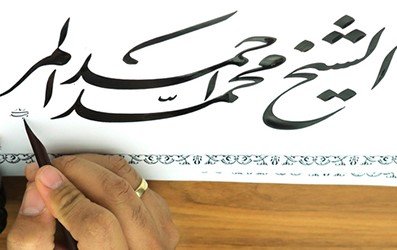 من جهته، قدّم الفنان الإماراتي خالد الجلاف ثلاثة أعمال تعرض للمرة الأولى، كونها تنتمي لمقتنيات شخصية، وحملت نصوصاً قرآنية، ومنها آية الكرسي. ولفت الجلاف الى انه اعتمد في اللوحات على الاسلوب الجديد الذي يقوم على الحداثة وارتباط اللون بالزخرفة، فكانت اسلامية تحمل الذهب مع الألوان الهادئة، الى جانب الزخرفة النباتية التي لا تغلب جانب الكتابة بل تمنح اللوحة الجمال والتكامل، مشيراً الى أن نوع الخط الذي استخدمه منحه القدرة على مده كالأبنية أو حتى الكوفي النيسبوري الذي يمنح الحروف الايحاء بكونها أوراق أشجار. وأكد ان اختياره للون يكون بالتناسب مع التصميم، منوهاً بأنه يمنح التصميم البنائي الألوان البنية التي تتناسب مع العمارة، بينما اللوحة التي تحمل الايحاء بالشروق جاءت ألوانها سماوية بدرجات الأزرق، في حين كانت الألوان هادئة في آية الكرسي، كونها من أعظم آيات القرآن الكريم، ولهذا كانت تحمل الكثير من الذهب في الزخرفة للدلالة على قدسية الآية وقيمتها الثمينة. وحول المعارض الخاصة بالخط، أشار الجلاف الى ان لوحة الخط تعيش عصرها الذهبي في الإمارات، فقد حظيت بدعم من المسؤولين والمهتمين، وكذلك يكرس هذا الفن من خلال المعارض السنوية التي باتت محطات ينتظرها الخطاطون وعشاق الخط، كما ان هناك جذباً لخطاطين من حول العالم، ومقارنة بدول عظيمة بدأ بها الخط منذ سنوات كمصر وسورية وتونس، فإن الإمارات تتقدم من حيث الاهتمام بهذا الفن، كون تلك الدول لم تنظم الا معارض قليلة متخصصة بفن الخط ومنذ سنوات، في حين ان الإمارات تقيم الدورات في هذا المجال، فباتت محط أنظار الخطاطين والمزخرفين. ونوه بأن للوحة الخط جمهورها، وتأخذ حظها بين الفنون، فهي ليست لوحة جمالية فقط بل لها بعد وطني، والناس يعرفون أنها فن عربي أصيلـ كما ان البيوت تزين بالخط اليوم.